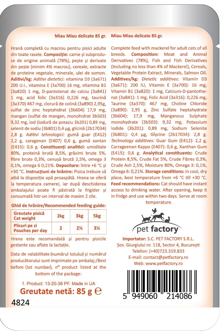 INGREDIENTE: carne si subproduse de origine animala, peste si derivate din peste (minim 4 % macrou), cereale, extracte de proteine vegetale, minerale, uleiuri si grasimi (ulei de somon 0,18%), diverse zaharuri.