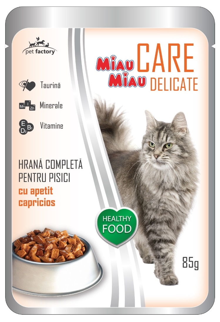 PLICULETELE MIAU MIAU CARE DELICATE CU MACROU IN SOS 12 x 85 g contin o hrana completa cu macrou pentru pisici adulte mofturoase.