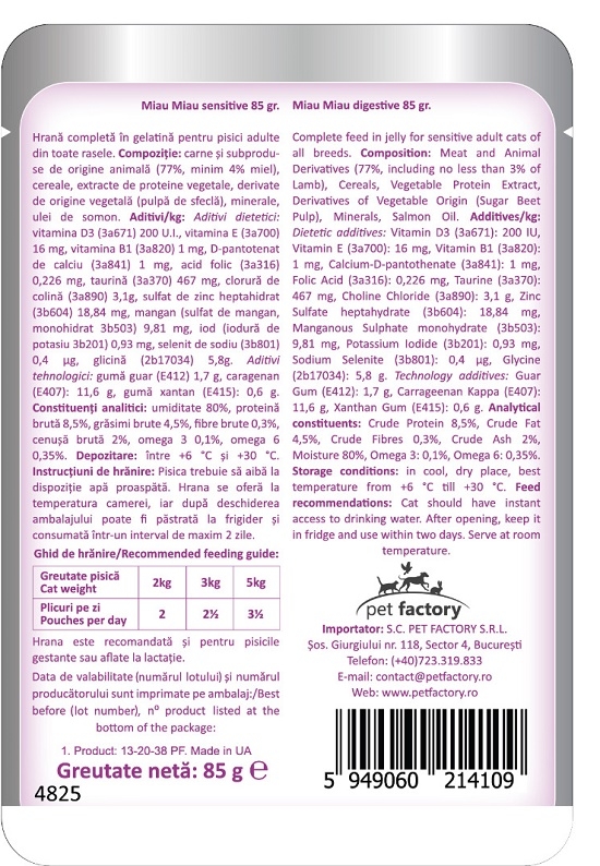 ADITIVI/KG: Aditivi dietetici: vitamina D3 (3a671) 200 U.I., vitamina E (3a700) 16 mg, vitamina B1 (3a821) 1 mg, taurina (3a370) 467 mg, clorura de colina (3а890): 3,1 g, zinc (sulfat de zinc, heptahidrat 3b604) 4,2 mg, mangan (sulfat de mangan, monohidrat 3b503) 3,12 mg, iod (iodura de potasiu 3b201) 0,64 mg, seleniu (selenit de sodiu 3b801) 0,2 mcg. Aditivi tehnologici: caragenan (Е407): 11,6 g, guma guar (E412) 1,7 g. Aditivi senzoriali: Aroma de pui, glicina (2b17034): 5,8 g.