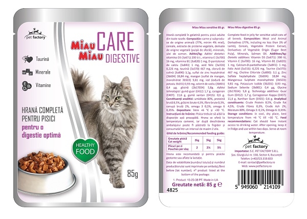 PLICULETELE MIAU MIAU CARE DIGESTIVE CU MIEL IN GELATINA 12 x 85 g contin o hrana completa cu carne de miel pentru pisici adulte pentru o digestie optima.