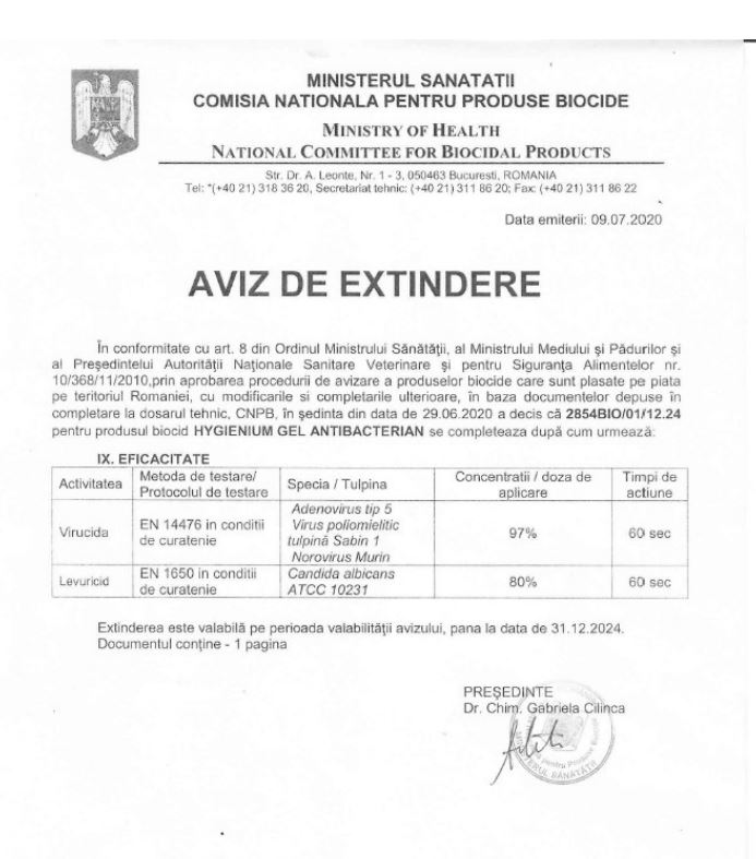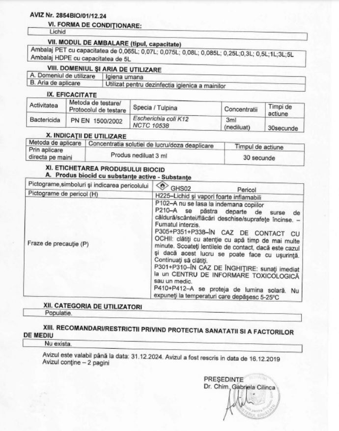 conform testului EN 1500 si Staphylococcus aureus, Pseudomonas aeruginosa, Enterococcus hirae, conform testului EN 1276.