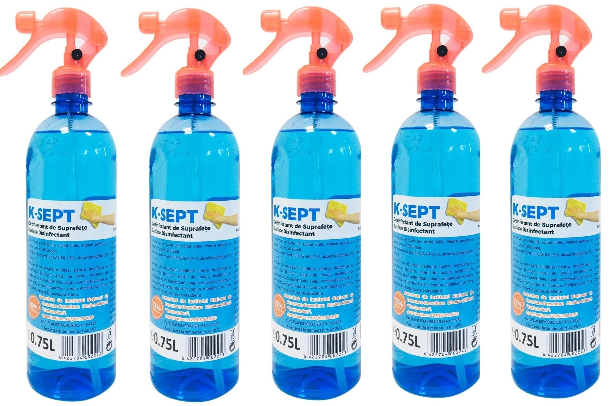 Pachet K-SEPT Dezinfectant solutie pentru suprafete pe baza de alcool 75%, cu pulverizator, 750 ml x 5 buc