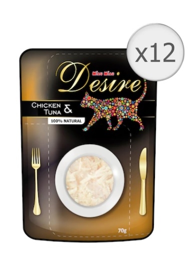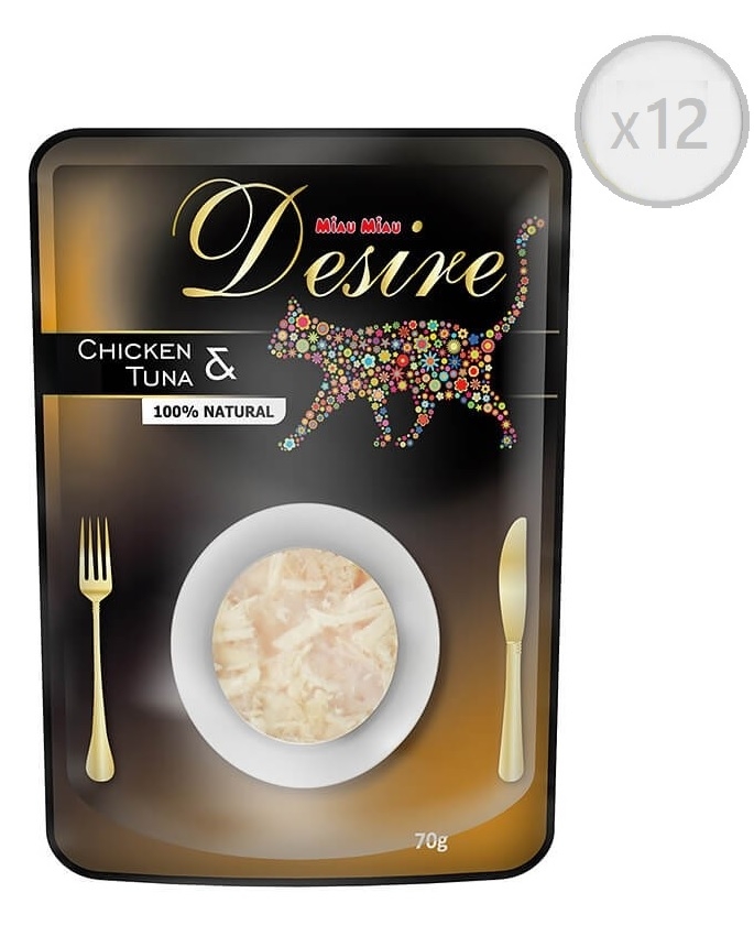 MIAU MIAU Desire reprezinta o gama de hrana umeda super premium dedicata pisicilor, compusa din 11 tipuri de conserve si 4 tipuri de plicuri, produse din materie prima de cea mai buna calitate, care nu contin sub-produse, la preturi accesibile. Pe langa ingredientele principale, carnea alba de ton si pui, sortimentele de hrana super premium MIAU MIAU Desire contin rata, somon, peste alb, ansoa, creveti sau surimi. Carnea este prelucrata manual, cu atentie sporita, si este gatita la abur, pentru a-si pastra prospetimea si substantele nutritive pe care le contine in mod natural. Hrana umeda Desire nu contine conservanti, coloranti sau arome artificiale.