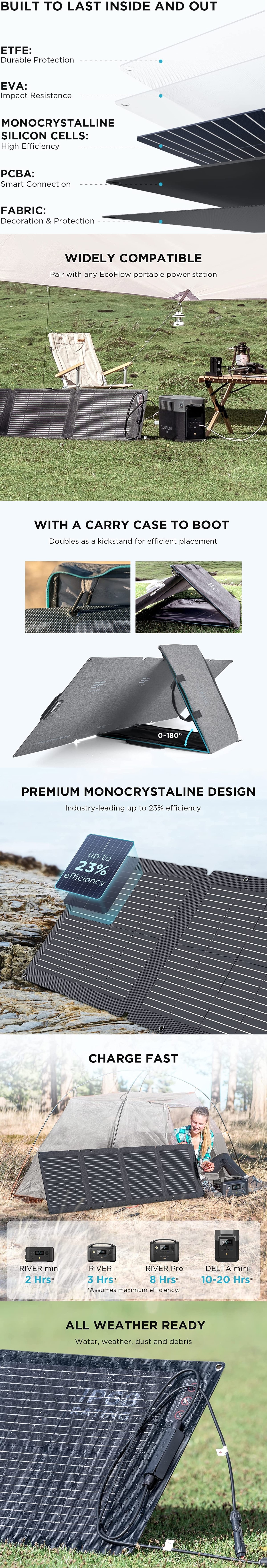 Panouri solare pliabile care sunt concepute pentru portabilitate maxima. Ideal ca panou solar RV, panou solar de camping si panou solar in aer liber. Incarcati oriunde. Cu cablul MC4 la XT60, pute?i incarca statiile de alimentare portabile EcoFlow din gama Delta si River. Poate fi legat in serie cu mai multe panouri EcoFlow 100W pentru a incarca mult mai rapid statia de alimentare portabila.