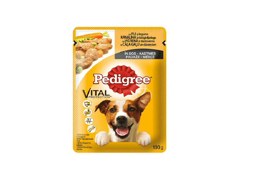 Pedigree plic hrana umeda pentru caini adulti, cu pui si legume in sos.