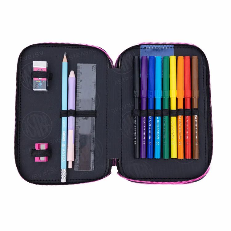 2 compartimente Organizator incapator cu accesorii de calitate PREMIUM creioane ASTRA 12 culori pixuri ASTRA 12 culori pixuri ASTRAPEN 2 bucati creion ASTRAPEN 1 bucata ascutitoare radiera foarfece ASTRA riglaSpecificatii