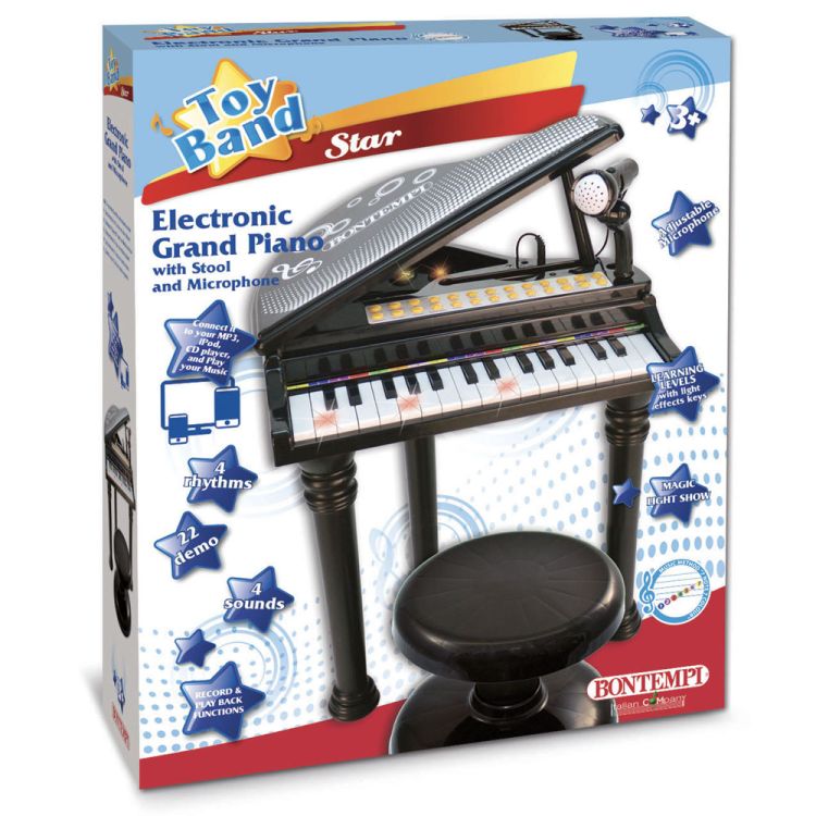 Bontempi Pian electronic pentru copii cu scaun si microfon negru. Pianul electronic fluorescent pentru copii cu microfon si scaun va va ajuta sa descoperiti sunete, stiluri muzicale si cantece. Pianul are 31 de clape, efecte luminoase. Pianul electronic vine predefintit cu 4 sunete, 4 ritmuri si 22 de piese demonstartive. 4 pad-uri pentru tobe. Microfon reglabil. Puteti inregistra si reda melodii. 3 niveluri de invatare prin lumini cheie. 3 picioare. Acoperire cu suport de sprijin. Reglati volumul si tempo-ul. Oprire automata. Conexiune priza la player MP3 (cablu inclus). Alimentare 4 baterii R6 / AA 1. 5V (nu sunt incluse). Beneficiile acestui instrument sunt familiarizarea cu muzica si ritmul, dezvoltarea abilitatilor sociale si cognitive, coordonarea miscarilor, atentia distributiva.