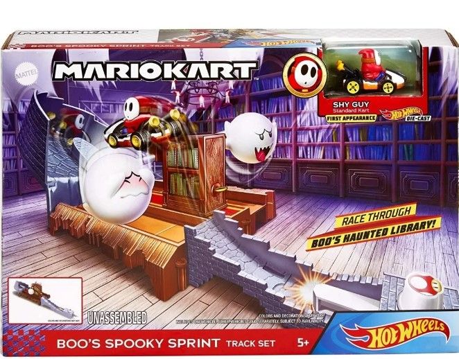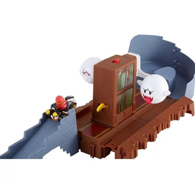 Hot Wheels da viata actiunii din celebrul joc Mario Kar cu piste incredibile inspirate de traseele epice ale jocului video iubit de generatii Concureaza cu Mario Kart impotriva prietenilor depaseste obstacolele si tine piept provocarilor de pe pista Mario Kart de la Hot Wheels ncarcati karturile in lansatoare si eliberati pentru a lansa masinile in jurul pistei Setul include multe accesorii pentru un joc competitiv si plin de actiune precum steaguri de numarare a turelor lansator obstacole si multe altele. Cresteti nivelul de dificultate al provocarilor prin reconfigurarea pistei si prin conectarea setului de circuit Mario Kart la alte seturi de piste. Setul Fantoma Infricosatoare contine fantoma infricosatoare Boo.Specificatii