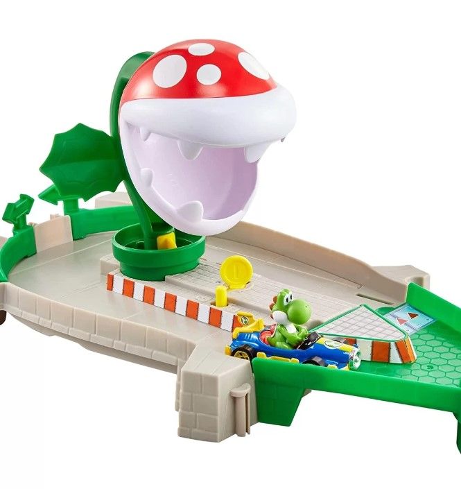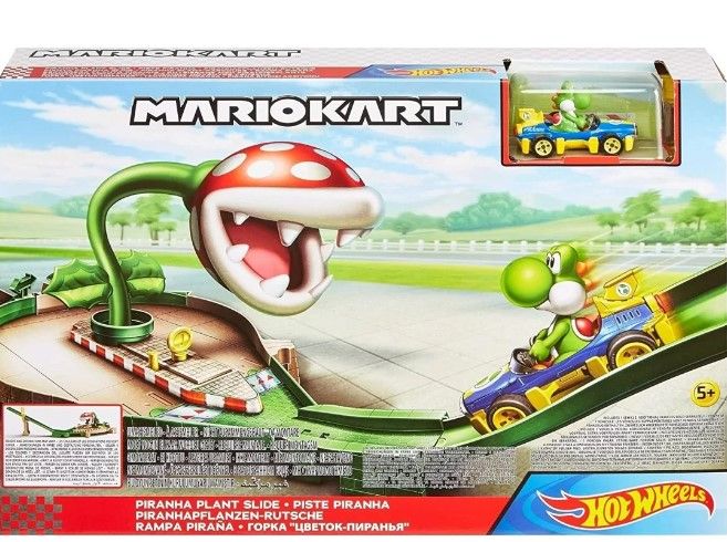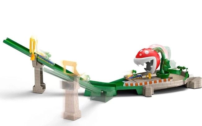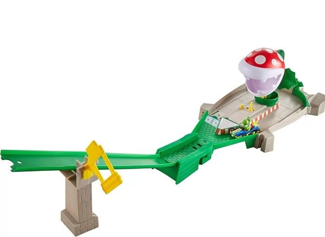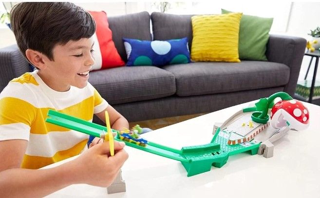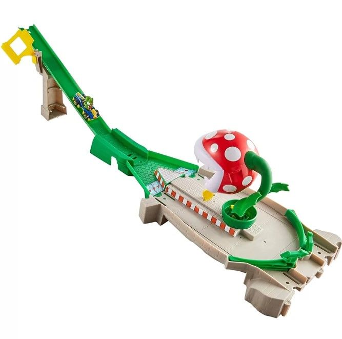 Hot Wheelsda viata actiunii din celebrul joc Mario Kart cu piste incredibile inspirate de traseele epice ale jocului video iubit de generatii Concureaza cu Mario Kart impotriva prietenilor depaseste obstacolele si tine piept provocarilor de pe pista Mario Kart de la Hot Wheels amp Icirc ncarcati karturile in lansatoare si eliberati pentru a lansa masinile in jurul pistei Setul include multe accesorii pentru un joc competitiv si plin de actiune precum steaguri de numarare a turelor lansator obstacole si multe altele. Cresteti nivelul de dificultate al provocarilor prin reconfigurarea pistei si prin conectarea setului de circuit Mario Kart la alte seturi de piste. Setul Ruinele Thwomp contine kartul Luigi.Specificatii