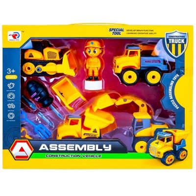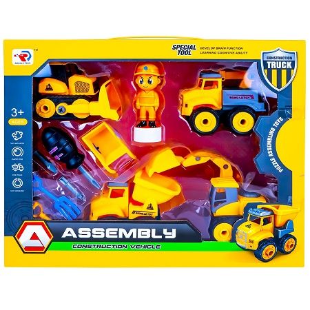 Descopera acest play set care iti va trezi simtul aventurii. Micii constructori harnici si pasionati pot sa inceapa lucrul Caracteristici - jucaria este confectionata din plastic - setul contine buldozer cu cupa camion tractare cu brat mobil cu carlig camion cu bena mobila excavator cu brat mobil figurina cu casca detasabila surubelnita cu 3 capete detasabile roaba furca lopata - cele 4 masini au rotile senilele platforma si bratele demontabile - lungime masini aproximativ 11 cm - jucaria stimuleaza motricitatea dexteritatea creativitatea si imaginatia copiilor Avertizare Produsul este nou si comercializat in ambalajul original al producatorului. Imaginile de pe site au caracter informativ. Produsul nu functioneaza cu baterii. Ambalajul trebuie indepartat recuperat si aruncat de catre un adult inainte de a se da spre utilizare copilului. Nu lasati ambalajele produselor la indemana copiilor. Se recomanda utilizarea produsului sub supravegherea unui adult. Produsul poate contine piese mici care se pot inghiti sau inhala de cei mici existand pericolul de sufocare sau nu este potrivita copiilor mai mici de 3 ani. Pastrati instructiunile si etichetele pentru referinte viitoare. Pastrati produsul departe de foc si nu il lasati in preajma temperaturilor ridicate si a umiditatii. Nerecomandat copiilor cu varsta mai mica de 3 aniSpecificatii