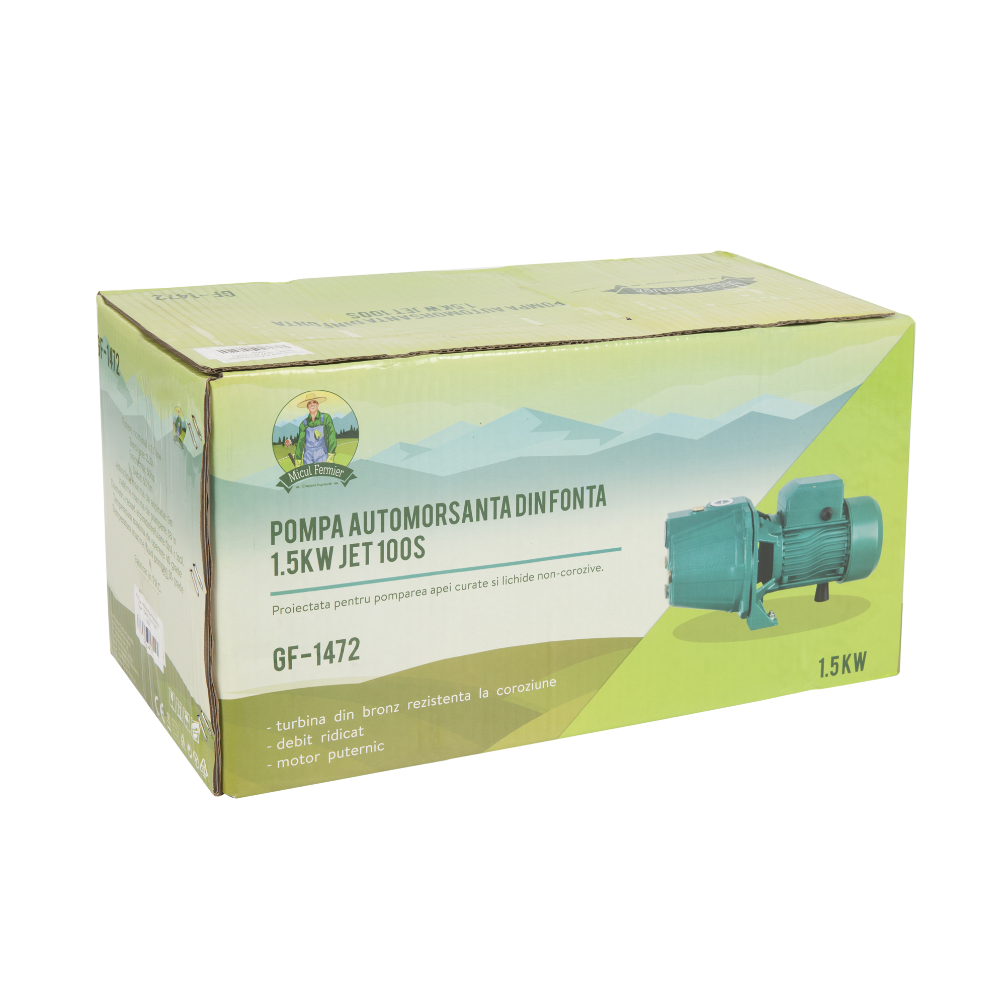 Pompa de apa autoamorsanta, JET100S este proiectata pentru pomparea apei curate si lichide non-corozive. Avantajele majore ale acestei pompe sunt fiabilitate, capul de descărcare mare, cap aspirare mare si timpul de auto-amorsare destul de scurt. Prin urmare,este utilizata pe scara larga pentru irigatii gradina, terenuri agricole, alimentare cu apă la clădiri înalte, pepiniere de flori, nave etc. Pompa apa de suprafata centrifugala autoamorsanta are o putere 1.5 kw. Turbina este din bronz rezistent la coroziune. Axul si corpul pompei sunt din inox.