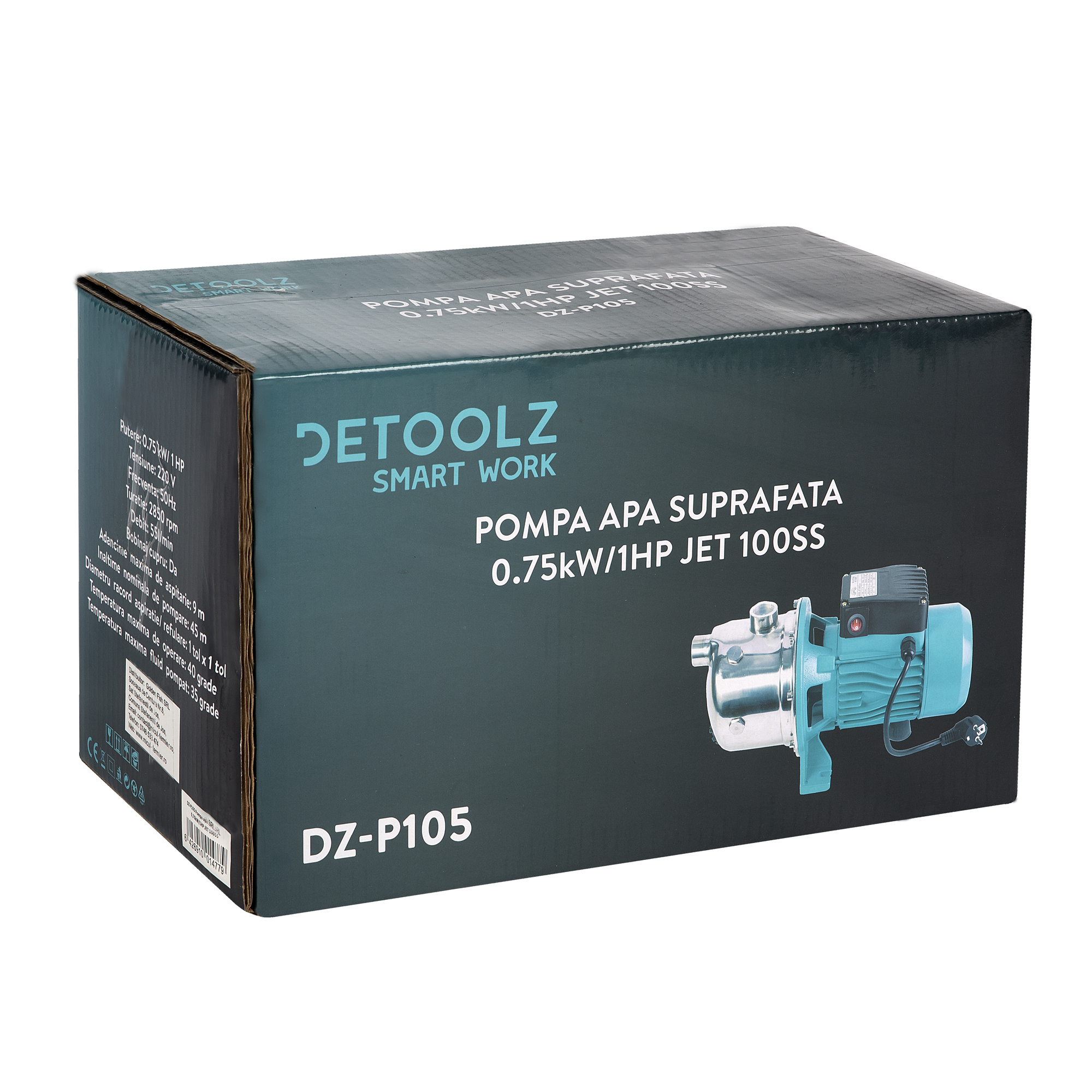 Pompa de apa 0,75kW/1HP, JET 100SS, Detoolz DZ-P105 se utilizeaza pentru alimentarea cu apa a imobilelor individuale rezidentiale, udarea gradinilor, asigurarea functionarii masinilor de spalat automate, boilerelor electrice, centralelor pe gaze cu doua circuite, puturilor, bazinelor naturale cu apa. Captarea apei se realizeaza din puturi, fantani, bazine naturale de apa. La adancimea maxima, amorsarea apei depinde de distanta orizontala de la put sau fantana pana la pompa.