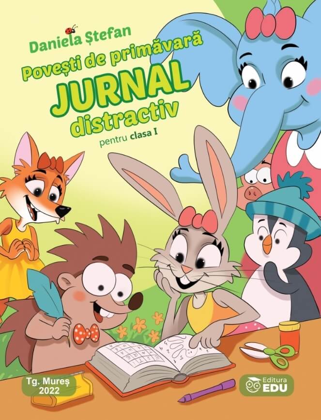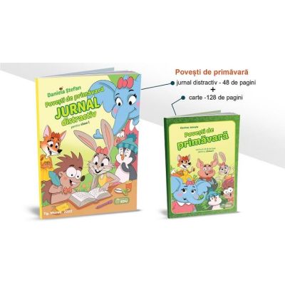 Simpaticele personaje s-au reintors cu noi aventuri neasteptate pline de umor si de voie buna. Cartea Povesti de primavara 128 de pagini color marime 20 5 x 13 cm contine 6 povesti cu texte usoare si ilustratii mari si sugestive pentru elevii clasei I. De-a lungul paginilor sunt marcate discret silabele pentru a facilita lectura micilor cititori. Cartea este insotita de un Jurnal distractiv 48 de pagini color 27 5 x 21 cm . Anul acesta Aricel vrea sa daruiasca tuturor fetitelor-arici martisoare facute chiar de el. Acest lucru insa il face pe bunicul sau sa caute un leac pentru durerile de picioare. Pinguinul Linu satul de atata iarna vrea sa stie cum arata primavara si toamna. Varul sau Apolodor ii face o prezentare amuzanta a celor doua anotimpuri. Ica Iepurica are parte de o intalnire neobisnuita cu un morcov auriu care indeplineste dorinte. Problema e ca morcovul are puteri limitate iar dorintele Icai sunt destul de greu de indeplinit. Familia Elefantescu se pregateste de curatenia de primavara. Eli este responsabil cu aspiratul prafului si al panzelor de paianjen iar acest lucru va isca o situatie extrem de comica. Experta in pacaleli Foxi a nascocit o farsa de milioane pentru lupul din padure care o confunda pe vulpita cu Scufita rosie. Purcelul Nelu ia parte la concursul de adunat trufe unde premiul este o piscina uriasa plina cu namol. Va reusi oare Nelu sa castige Dupa o lectura atat de amuzanta elevii pot completa Jurnal distractiv plin de jocuri si activitati educative rebusuri ghicitori si multe alte surprize. CUPRINS Povestea 1 - Aricel iubeste primavara Povestea 2 - Linu vrea o schimbare Povestea 3 - Ica Iepurica si morcovul auriu Povestea 4 - Curatenia de primavara Povestea 5 - Vulpita... rosie Povestea 6 - Concursul de adunat trufeSpecificatii