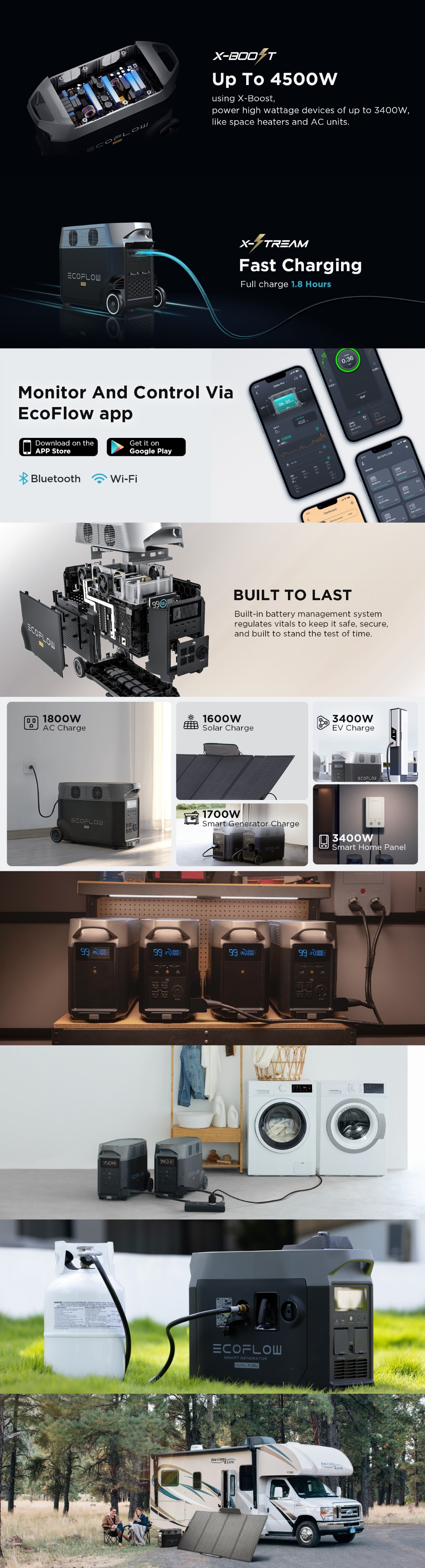 Alegeti dintre incarcarea la statia EV, solara, prizele de perete, folosind generatorul inteligent de exterior sau prin intermediul unei prize auto. Mai rapid decat orice alt generator solar de 3000 de wati. Continuati sa mergeti kilometri intregi atunci cand vehiculul dvs. electric ramane fara baterie.