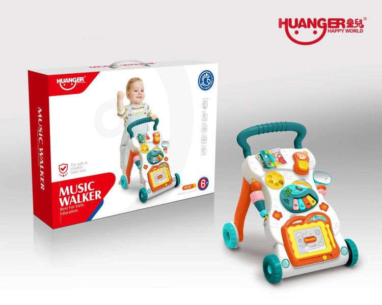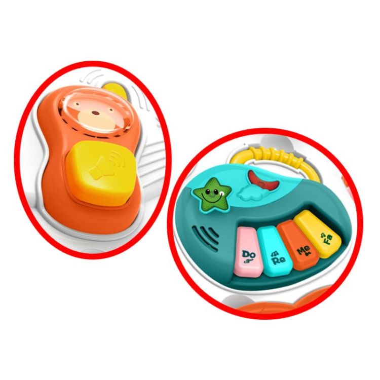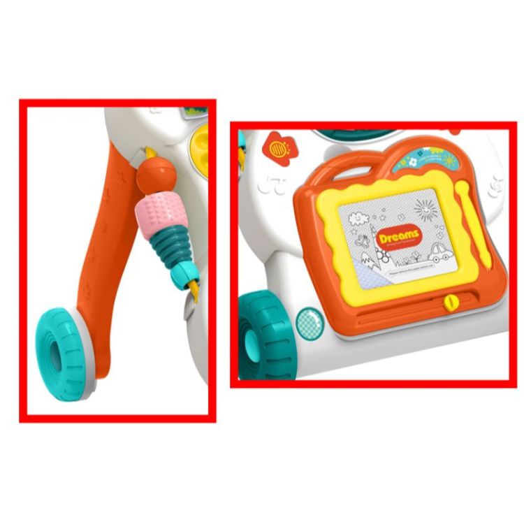 Jucaria contine parti detasabile tabla magnetica, pe care se poate scrie apoi se sterge, telefonul cu buton de claxon, pianul cu clapete cu note muzicale, jucaria contribuie la dezvoltarea creativitatii, a indemanarii si a motricitatii, rotile sunt fabricate dintr-un material plastic special, care nu zgarie. Produsul sprijina dezvoltarea abilitatilor manuale si a perceptiei vizuale si stimuleaza copilul sa recunoasca culorile, formele, dimensiunile si relatiile cauza efect.