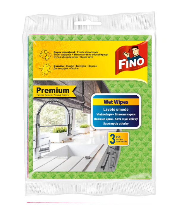 Lavete umede PREMIUM Fino, 3 bucati/pachet; Sunt foarte durabile si absorbante, datorita structurii puternice din celuloza. Ele sunt perfecte pentru stergerea uscata a chiuvetelor si a altor suprafete. Sunt usor de clatit. Pot fi spalate si la masina de spalat la o temperatura de pana la 60°C. Se recomanda clatirea lavetelor cu apa, inainte de prima utilizare. Ingrediente: celuloza.