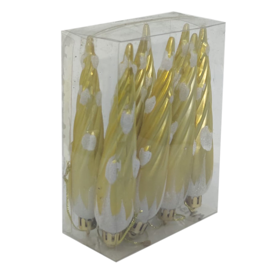 Setul contine 8 globuri, de culoare aurie cu alb, ambalate intr-o cutie transparenta in forma dreptunghiulara. Acest mod de ambalare, pe langa faptul ca este foarte practic, ne duce cu gandul la magia sarbatorilor si la traditia de a primi si a oferi cadouri. Astfel, acest set de globuri poate fi oferit cadou unei persoane dragi, nemaifiind necesara ambalarea suplimentara sau poate infrumuseta bradul dumneavoastra de Craciun.