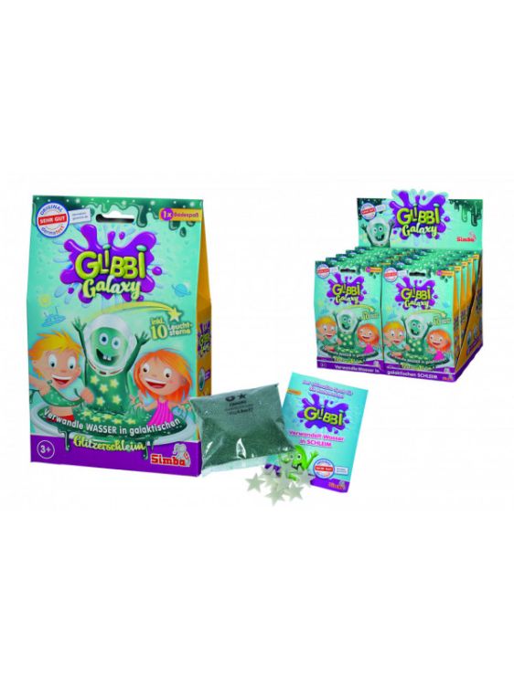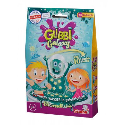 Glibbi Galaxy transforma apa in slime cu sclipici galactic. Dupa joaca doar adauga apa si las-o sa se scurga . Ssetul include si 10 stele cu efect fluorescent. Pur si simplu turnati pudra in apa urmariti transformarea in slime cu sclipici verde glorios si experimentati o multime de distractie la baie. Apoi doar diluati cu apa si scurgeti. Glibbi nu se lipeste nu pateaza pielea sau cada si datorita absentei totale a conservantilor aromelor artificiale si iritantilor este complet sigur din punct de vedere dermatologic.Specificatii