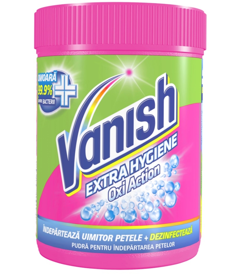 Vanish Extra Hygiene Pudra combina: sistemul de detectare a petelor, care functioneaza pe toate tipurile de pete, chiar si pe cele dificile de grasime si agenti speciali de igienizare, ce omoara 99,9 % dintre bacterii.