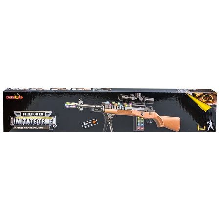 Baietii adora jucariile sub forma unor pusti pistoale sau imitatii a altor arme. Cu cat sunt mai realiste mai zgomotoase si mai mari cu atat bucuria celor mici este mai mare. Caracteristici - Pusca are sunete ce imita realitatea lumini iar teava se misca fata-spate. Pentru aceasta are nevoie de 3 baterii AA 1. 5V nu sunt incluse . Bateriile se introduc in pozitia corecta respectandu-se polaritatea. Compartimentul bateriilor trebuie sa fie curat. Bateriile epuizate se schimba si se recicleaza conform normelor in vigoare. In cazul neutilizarii jucariei pentru mai mult timp se scot bateriile pana in momentul refolosirii. - Arma necesita asamblare. Aceasta este usoara cele 2 piese luneta si suportul pustii trebuind doar introduse pe sinele corespunzatoare. - Copiii se pot juca alaturi de prieteni avand un timp activ distractiv si plin de imaginatie. Efectul jocului asupra dezvoltarii abilitatilor motrice este deosebit de important iar copilul prin joc isi coordoneaza miscarile cu atentia vizuala. In final prin aceste jocuri copilul intra in contact cu conceptele de bine si rau dezvoltand abilitati sociale si sentimentul de incredere si empatie. - Jucaria este ambalata in cutie din carton. Avertizare Produsul este nou si comercializat in ambalajul original al producatorului. Imaginile de pe acest site au caracter informativ. Ambalajul trebuie indepartat recuperat si aruncat de catre un adult inainte de a se da spre utilizare copilului. Nu lasati ambalajele produselor la indemana copiilor. Se recomanda utilizarea produsului sub supravegherea unui adult. Produsul poate contine piese mici care se pot inghiti sau inhala de cei mici existand pericolul de sufocare sau nu este potrivita copiilor mai mici de 3 ani. Pastrati instructiunile si etichetele pentru referinte viitoare. Pastrati produsul departe de foc si nu il lasati in preajma temperaturilor ridicate si a umiditatii. Datorita masurarii manuale a produsului poate exista o diferenta minora fata de dimensiunea reala a produsului.Specificatii