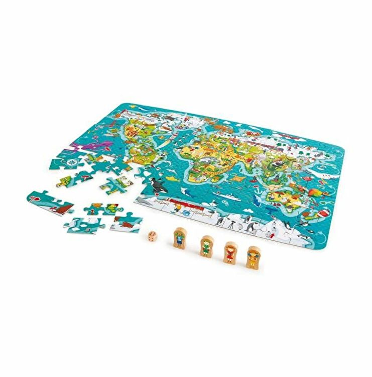 Concureazacu prietenii din intreaga lume cu acest joc distractiv doi in unu. Mai intai finalizati puzzle-ul din 100 de piese care arata tarile lumii. Apoi, folositi personajele din lemn pentru a calatori pe fiecare continent. Include un poster pe doua fete. Completati puzzle-ul si aflati despre diferitele natiuni, viata salbatica si reperele lor. Foloseste cele patru personaje din lemn si zarurile pentru a juca un joc de curse in jurul lumii. Afisul contine instructiuni despre joc si mai multe informatii despre tari. Include 100 de piese de carton, 4 figuri de joc din lemn, 1 zar si un poster pe doua fete cu o harta a lumii si instructiuni de joc.