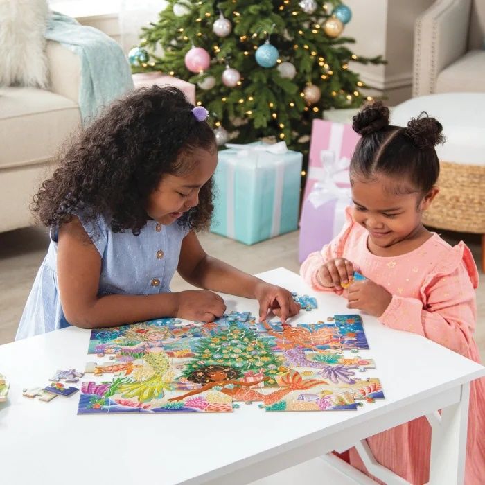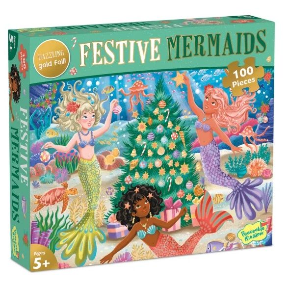 Puzzle-ul Craciunul Sirenelor este cadoul perfect pentru micutele pasionate de sirene. Piesele cu accente aurii adauga o nota de stralucire speciala, iar imaginea finala dezvaluie o scena subacvatica festiva, bogata in detalii, cu sirene si alte creaturi marine impodobind bradul de Craciun.