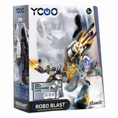 Robo Blast este un robot programabil care poate efectua pana la 20 de actiuni expresii faciale LED emite efecte sonore robotizate poate dansa pe melodiile instalate include posibilitatea de control cu miscarea mainilor si modul lupta prin care trage cu sageti. Setul contine 1 robot o telecomanda 3 sageti.Specificatii