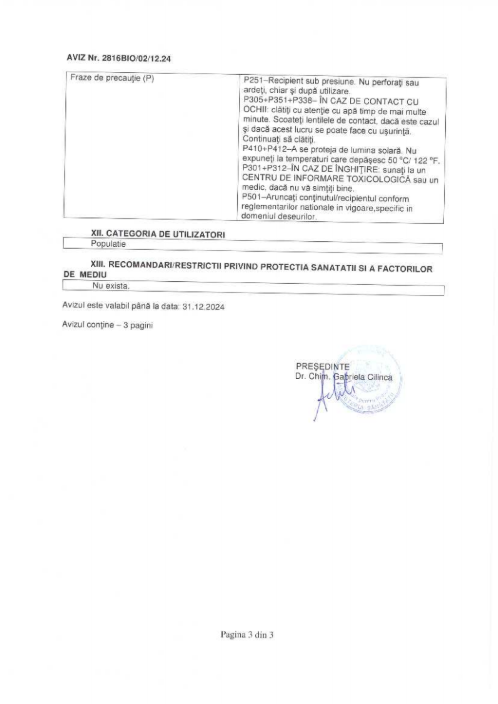 Nu pateaza. Aerosol extrem de inflamabil. Recipient sub presiune. Poate exploda daca este incalzit. Provoaca o iritare grava a ochilor. Daca este necesara consultarea medicului, aratati recipientul sau eticheta produsului. A nu se lasa la indemana copiilor. A se pastra departe de surse decaldura, suprafete fierbinti, scantei, flacari si alte surse de aprindere. Fumatul interzis. Nu pulverizati deasupra unei flacari deschise sau a unei alte surse de aprindere. Nu perforati sau aprindeti , chiar si dupa utilizare.