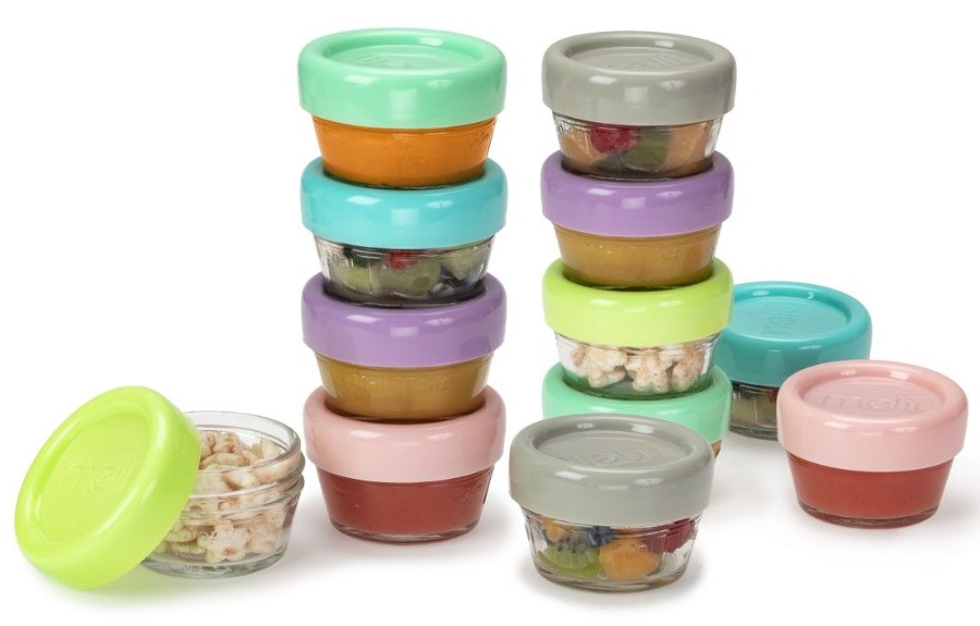 Cu setul de 12 recipiente din sticla pentru hrana poti transporta si depozita gustarile intr-un mod sanatos Acest recipient de mancare de dimensiuni potrivite pentru copii face gustarile distractive si are in acelasi timp un capac ermetic si antipicurare pentru a preveni mizeriile. Recipientele de 59 ml pentru mancare pentru bebelusi de la Melii fac usor de portionat depozitat si servit mancarea bebelusului blocand prospetimea prevenind inghetarea in congelator si evitand varsarea in geanta pentru scutece sau cutia de pranz. Inelele din silicon inchid perfect capacele. Marcajele durabile de masurare meticulos gravate pe sticla raman lizibile in timp permitandu-va sa portionati cu usurinta cantitatea de care aveti nevoie. Fabricat din sticla un material natural prietenos cu mediul si reciclabil Capace ermetice si antipicurare 100 sigur pentru alimente neporos si fara substante chimice nocive fara BPA plumb cadmiu PVC ftalati Potrivit pentru congelator cuptor cu microunde si masina de spalat vaseSpecificatii