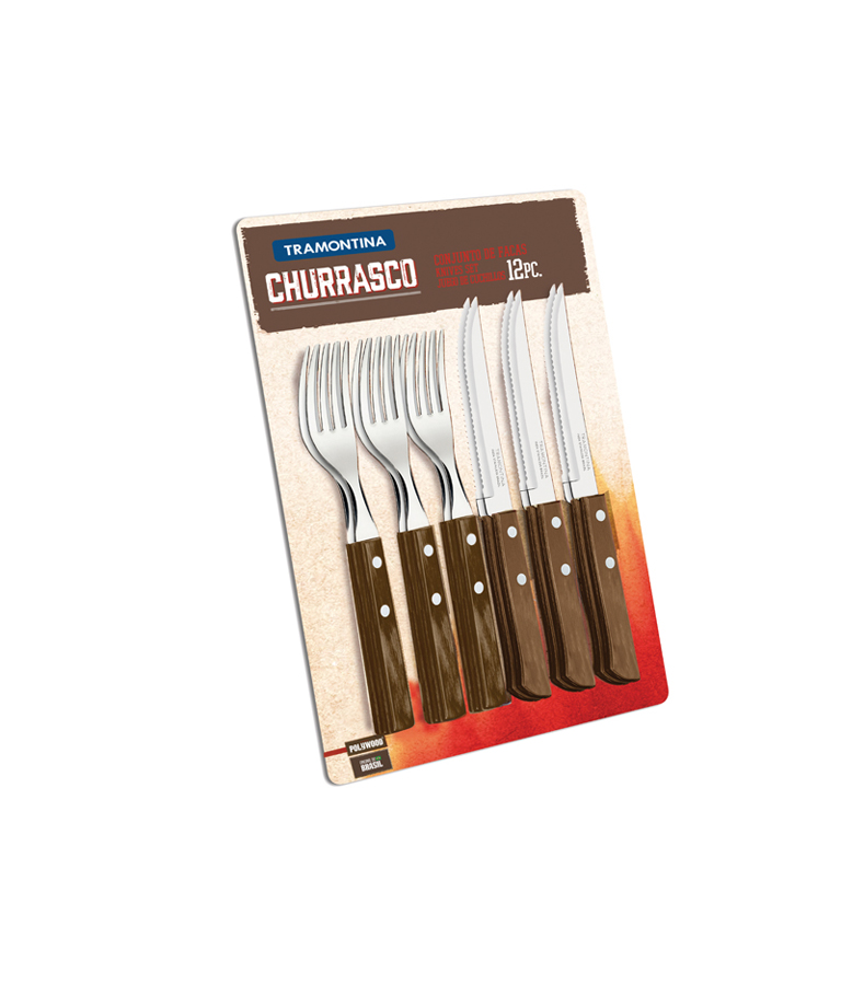Set 12 tacamuri pentru gratar gama POLYWOOD : 6 cutite pentru friptura, lungime lama 127mm, lungime totala 208 mm + 6 furculite, lungime totala 190 mm ; tacamurile sunt fabricate din inox de foarte buna calitate, isi mentin stralucirea dupa o utilizare indelungata, manerul este fabricat din lemn tratat, are o textura fina, este rezistent la temperaturi inalte si impact; se pot curata in masina de spalat vase.