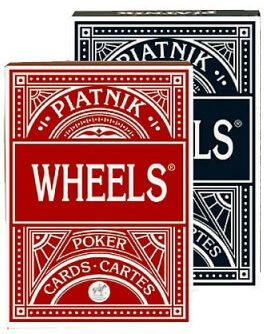 Set de 2 pachete a 52 de carti plus 3 jokeri fiecare poker size un pachet cu model rosu pe spate celalalt cu model albastru. Cartile de joc Wheels sunt din carton plastifiat placute la atingere si in acealasi timp rezistente in timp. Finisajul este deosebit de tip canvas care asigura o alunecare excelenta a cartilor de joc atunci cand sunt amestecate sau impartite. Cu aceste carti de joc clasice se poate juca orice joc Poker Canasta Bridge Whist Rent etc. Cartile sunt din carton plastifiat placute la atingere si in acealasi timp rezistente in timp.Specificatii