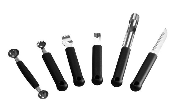 Set unelte decorare - 6 piese. Lama din otel Inoxidabil. Maner din polipropilena. Se poate spala la masina de spalat vase. Contine: - Lingurita pepene dubla; - Lingurita pepene zimtata; - Cutit lamaie; - Cutit canal; - Cutit mere; - Cutit decorare.Specificatii
