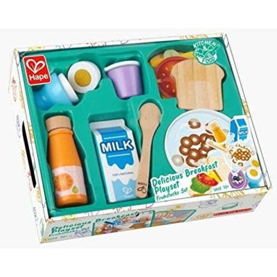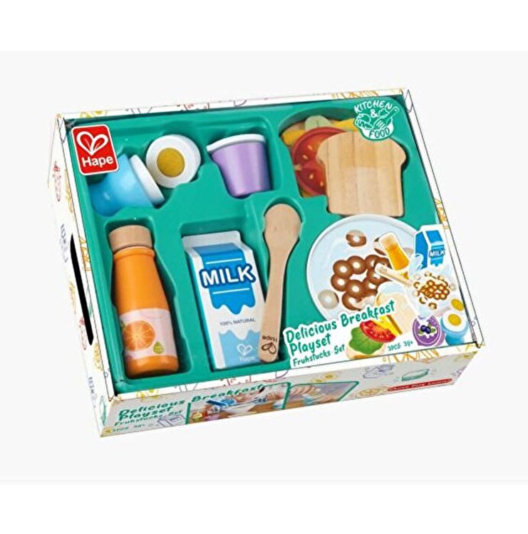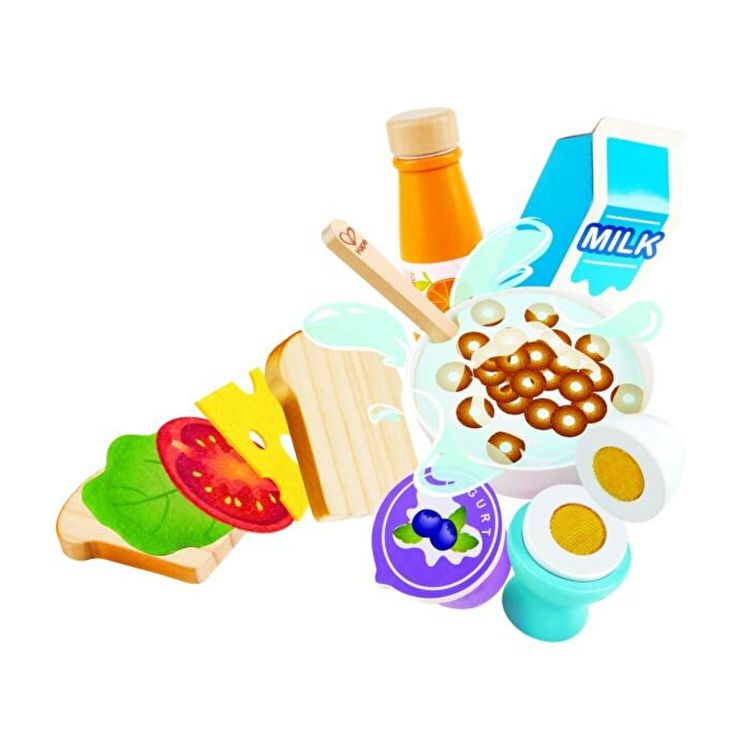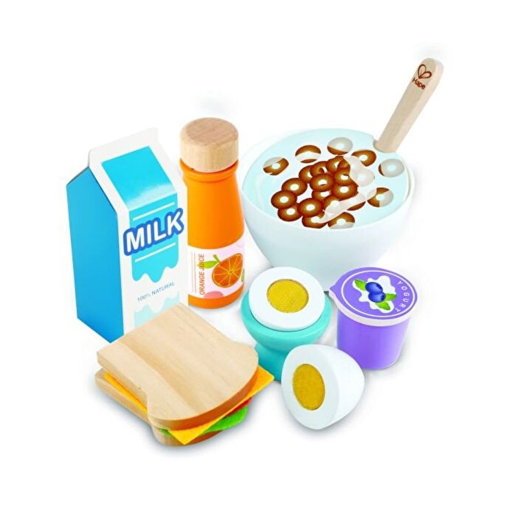 Pregateste-te pentru cea mai importanta masa a zilei cu acest set de mic dejun distractiv. Include iaurt cu capac de deschidere, lapte si o sticla de suc de portocale care face clic atunci cand intoarceti capacul. Include, de asemenea, un ou cu cupa de oua, un castron cu fulgi de ovaz cu o lingura, doua felii de paine prajita si cate o felie de rosii, salata si branza. Aveti un mic dejun sanatos cu acest set minunat! Marginile rotunde netede sunt perfecte pentru degetele mici de prins si de jucat.