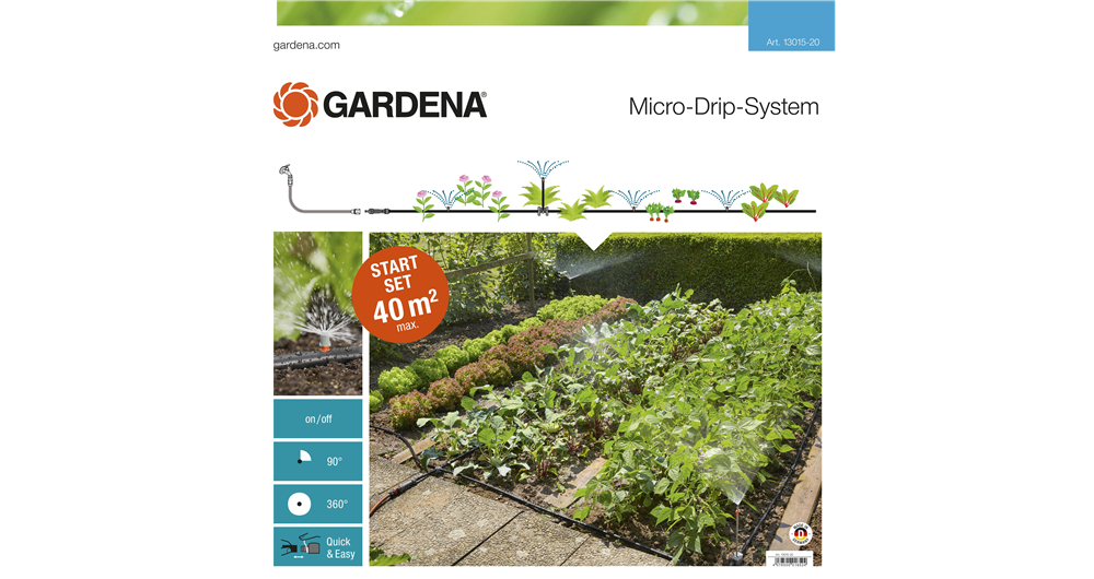 GARDENA Start Set Micro-Irigare pentru brazde este potrivit pentru irigarea convenabila a brazdelor de flori si legume fiind totodata, ideal pentru perioadele scurte de vegetatie a rasadurilor. Filtrul reductor de presiune este conectat la robinet prin intermediul unui conector pentru furtun. Plantele sunt udate fin prin intermediul sistemului cu picuratoare si a mini-aspersoarelor cu diferite unghiuri de udare. Sistemul patentat de conectare “Quick & Easy” (“Rapid & Usor”) permite ca toate componentele sa se conecteze si deconecteze rapid si usor.