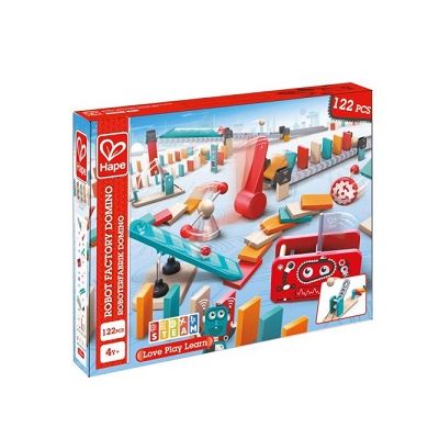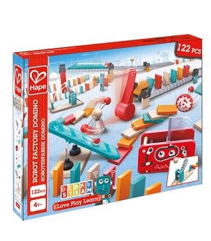Exista miscare si surprize in fiecare etapa a acestui set de domino distractiv cu tematica robotica. Puneti piesele de domino in miscare si urmariti cum elibereaza o minge si dezlantuie puternicul ciocan robot. Urmareste intregul proces de la inceput pana la sfarsit Pe masura ce mingea se ciocneste cu ciocanul robot energia sa potentiala este eliberata si mai multe piese de domino se rastoarna Un steag final apare pentru un sfarsit dramatic in timp ce ultima ta piesa de domino cade. Copiii vor fi incantati de reactia in lant.. Mingea dezlantuie ciocanul care impinge mai multe piese de domino si lanseaza roata impulsului. Tunelul transparent dezvaluie procesul de rulare al mingii. Urmariti efectul de domino in timp ce piesele dvs se rastoarna. Jucariile sunt realizate din lemn folosind materiale ecologice vopsite in culori atragatoare cu vopsele nontoxice care depasesc cele mai inalte si stricte standarde internationale de siguranta si calitate precum EN71 ISO9001 ASTM F963 si altele. De multi ani Hape a creat jucarii fantastice de inalta calitate folosind materiale ecologice si durabile fiecare produs fiind atent proiectat pentru a stimula abilitatile senzoriale fizice si emotionale. Atentie Nu lasati ambalajele jucariilor produselor la indemana copiilor. Indepartati orice ambalaj al jucariei produsului inainte de a da jucaria produsul copilului. Va rugam sa supravegheati copilul in timp ce se joaca foloseste acest produs. Pastrati instructiunile si etichetele pentru referinte viitoare. Pastrati jucaria produsul departe de foc feriti jucaria produsul de temperaturi ridicate si umiditate.Specificatii