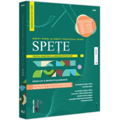 Proba scrisa de verificare a cunostintelor juridice face parte din prima etapa a concursului de admitere la INM in magistratura urmarind sa puna in evidenta capacitatea de analiza critica si sinteza coerenta in abordare si exprimare intelegerea institutiilor de drept penal si procesual penal fiind conceputa in ansamblul concursului si perceputa de catre candidati ca fiind cea mai dificila dintre probe. De aceea pregatirea temeinica si in acelasi timp aplicata este esentiala pentru reusita. Prezenta lucrare urmareste cu precadere verificarea modalitatii de aplicare a cunostintelor juridice in materia dreptului penal si a procedurii penale fiind realizata de un colectiv de judecatori practicieni cu experienta in materia penala si procesual penala precum si cu experienta didactica. Aflata la a treia editie imbogatita cu un numar de 26 de spete fata de editia anterioara lucrarea insumeaza 50 de teste reprezentand 100 de spete de drept penal si drept procesual penal insotite de baremele de rezolvare cu largi explicatii si trimiteri la textele de lege la doctrina si jurisprudenta. Fiecare test contine cate 2 spete de drept penal si drept procesual penal concepute astfel incat sa acopere in intregime tematica de concurs sa raspunda nevoilor de aprofundare a institutiilor dreptului ce fac obiectul concursului si in acelasi timp sa faciliteze deprinderea modalitatii adecvate de abordare a acestui tip de proba. Editiile anterioare au fost apreciate de catre candidati ca fiind un suport incontestabil pentru pregatirea cu succes a acestei probe de aceea autorii au pastrat si in editia de fata aceeasi modalitate de elaborare si rezolvare a spetelor cu largirea cadrului de verificare prin adaugarea de noi probleme de drept. Rezolvarea spetelor ajuta candidatii sa-si aprofundeze cunostintele teoretice si practice si sa-si dezvolte capacitatea de argumentare si rationamentul logico-judiciar. Un alt punct forte al lucrarii este acela ca structura spetelor este in acord cu structura recomandata drept model de Institutul National al Magistraturii publicata in iulie 2023 pe site-ul acestei institutii. Testele sunt realizate in concordanta cu legislatia si cu deciziile obligatorii ale Inaltei Curti de Casatie si Justitie si ale Curtii Constitutionale a Romaniei in vigoare la data publicarii concursului de admitere in profesie 07. 07. 2023 si reprezinta un instrument eficient nu numai pentru pregatirea candidatilor pentru admiterea la Institutul National al Magistraturii in magistratura ci in acelasi timp se adreseaza si judecatorilor si procurorilor stagiari pentru pregatirea examenului de capacitate precum si candidatilor care acced in alte profesii juridice auditorilor de justitie si studentilor la drept. De asemenea grilele si raspunsurile au fost adaptate conform ultimelor modificari ale Codurilor penal si de procedura penala avand in vedere urmatoarele acte normative Legea nr. 171 2023 Legea nr. 200 2023 Legea nr. 201 2023 Legea nr. 213 2023 Legea nr. 214 2023 Legea nr. 217 2023 Legea nr. 248 2023.Specificatii