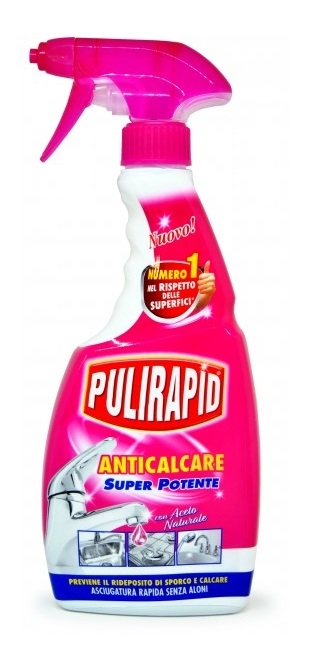 Pulirapid Anticalcare cu otet alb, pentru suprafete dure, este eficient impotriva calcarului in baie si bucatarie; folosit in mod repetat acesta impiedica depunerea calcarului