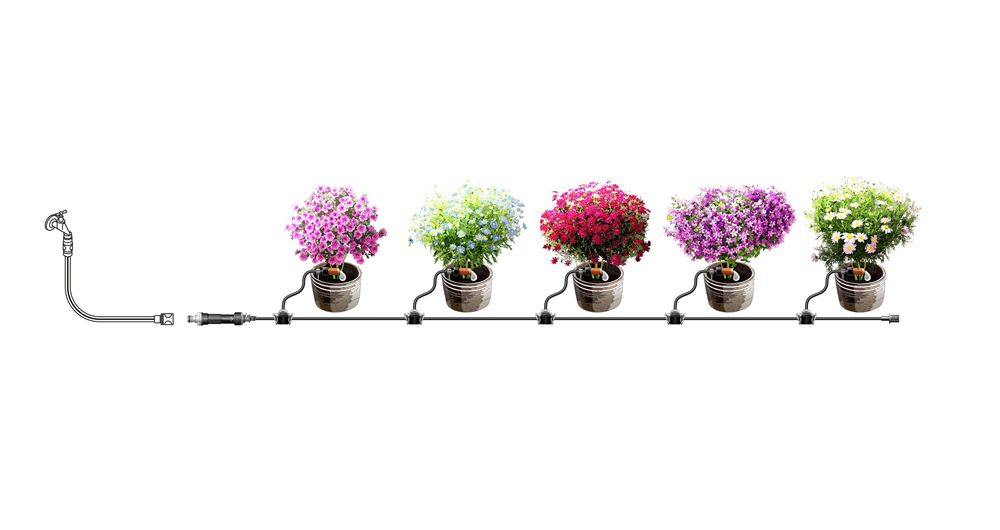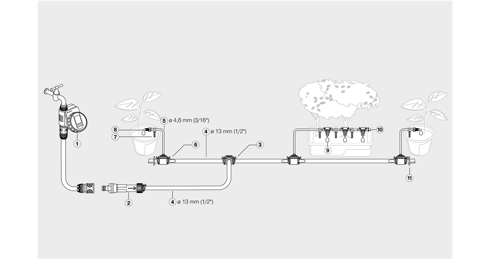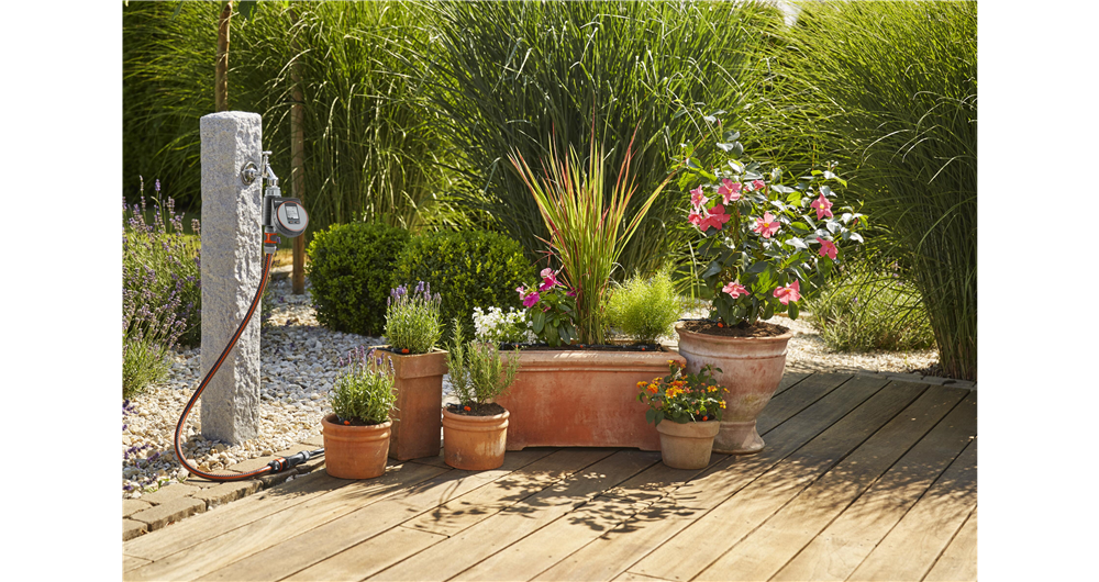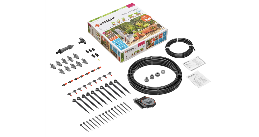 Start Setul micro-irigare M cu programator GARDENA include toate componentele necesare pentru irigarea automata cu economisire de apa a 7 ghivece si 3 jardiniere. Filtrul reductor de presiune este conectat la robinet prin furtun. Ghivecele sunt irigate cu exactitate si individual prin sistemul de tevi utilizand picuratorii. Sistemul este controlat automat folosind Programatorul Flex GARDENA.Specificatii