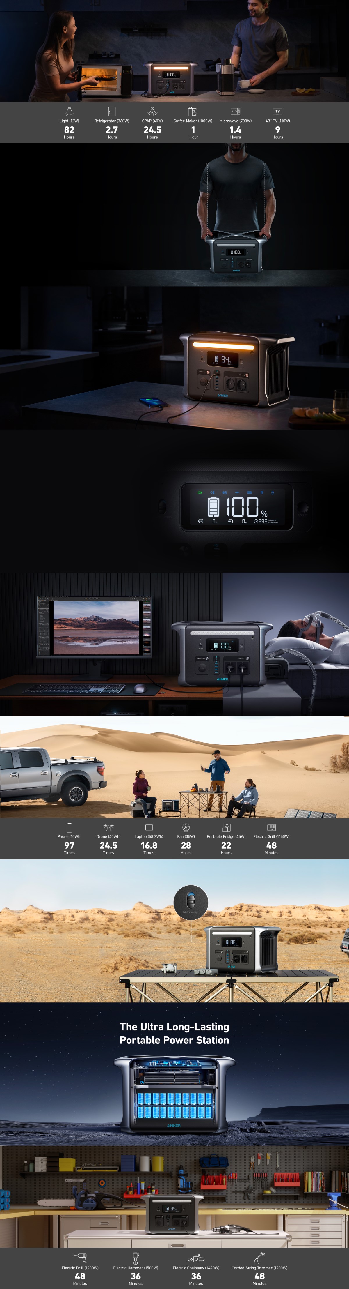 Cu o capacitate de 1229Wh si o putere de 1500 de wati, aceasta statie de alimentare portabila Anker PowerHouse este o solutie ideala pentru a alimenta toate dispozitivele si aparatele esentiale, cum ar fi un gratar electric, un aparat de cafea si multe altele. Statia de alimentare este echipata cu 2 porturi AC, 4 porturi USB-A, 2 porturi USB-C si o priza auto.