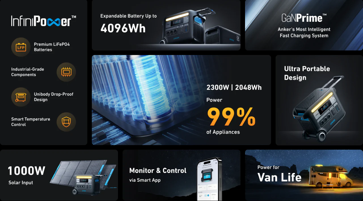 Statia de alimentare portabila Anker 767 este echipata cu o capacitate uriasa de 2048Wh si o iesire de 2300W AC pentru a alimenta in mod convenabil aproape orice aparat electric - de la cele esentiale pentru viata in afara retelei, cum ar fi cuptoarele cu microunde si frigiderele, pana la uneltele profesionale, cum ar fi masinile de gaurit si luminile profesionale de mare putere.