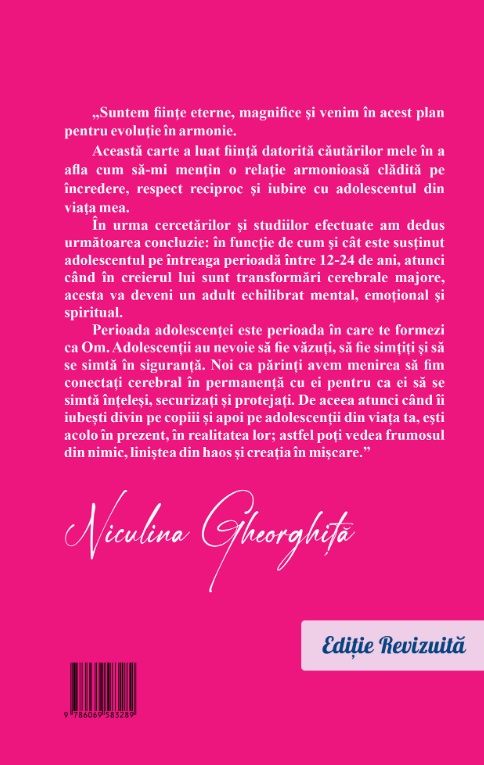Aceasta carte este necesar sa fie prezenta in toate familiile pentru ca este un adevarat manual de studiu pentru intelegerea si sustinerea adolescentilor din viata noastra si nu numai , pentru ai putea ghida sa devina adulti siguri pe ei si existenta lor . Recomand din toata inima aceasta carte care pe mine m-a ajutat foarte mult sa arat empatie si intelegere fata de adolescenta care am fost si sa ma conectez in mod real cu adolescentul prezent acum in viata mea, fetita mea Ilinca. Multumesc minunatei autoare Niculina Gheorghita!