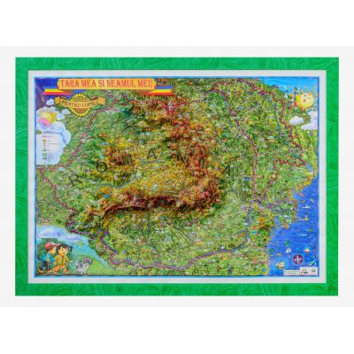Harta reprezinta un concept unic in Romania ce permite reproducerea scoartei terestre in relief ajutandu-i pe copii sa inteleaga si sa-si insuseasca notiunile geografice elementare privind spatiul romanesc. Folosind culori sugestive sunt reprezentate toate formele de relief munti ape campii etc precum si animalele pasarile si planstele specifice fiecarei zone. Imaginea este intregita de un sir de obiective culturale istorice naturale ce abia asteapta sa fie descoperite Caracteristici tehnice Harta este executata din PVC de 0. 25-0. 45 mm. Pe spate este fixata cu placi de mucava prinse de rama prin capsare. Designul este definitivat de eleganta ramei executata din poliuretan de inalta densitate cu latimea de 40 mm si inaltimea de 13 mm imbinata cu cate 3 capse tip V in fiecare colt. Dimensiune 1400x1000mmSpecificatii