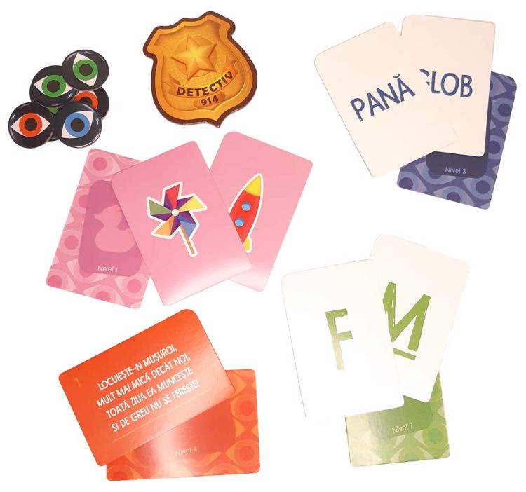 Te-am Ochit este un board game inovator in care copilul va exersa in joaca alfabetul si cuvinte frecvente din limba romana. Premisa amuzanta ilustratiile atragatoare si mecanica de joc antrenanta il vor face sa reia cu drag jocul oferindu-i ore intregi de distractie. Jocul are patru niveluri de dificultate fiecare dintre ele ajutand la fixarea anumitor competente vizualo-lingvistice. Copilul va trebui sa gaseasca imagini sa recunoasca sunetul initial si sunetul final sa citeasca cuvinte simple si sa dezlege ghicitori toate fiind utile activitatii premergatoare citirii 2-4 jucatoriSpecificatii