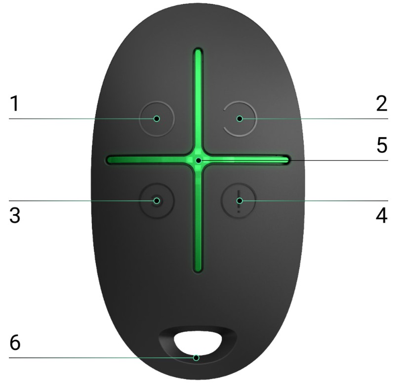 Ajax SpaceControl este o telecomanda cu protecție împotriva clicurilor accidentale. Permite setarea sistemului Ajax în modul armat, noapte sau dezarmat și pornirea unei alarme.