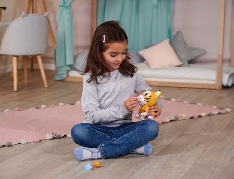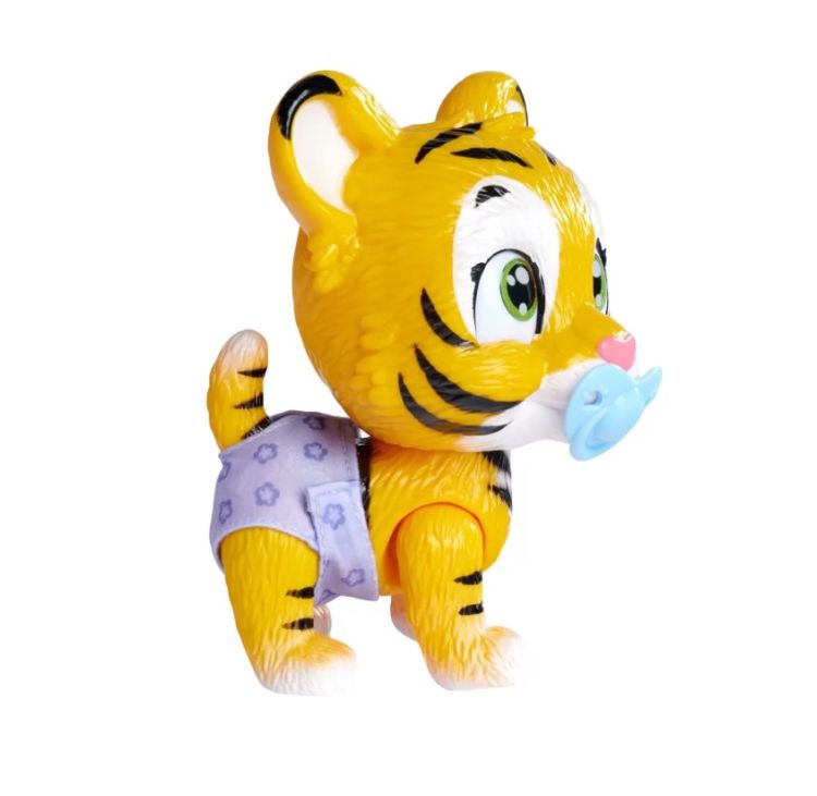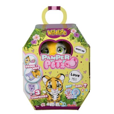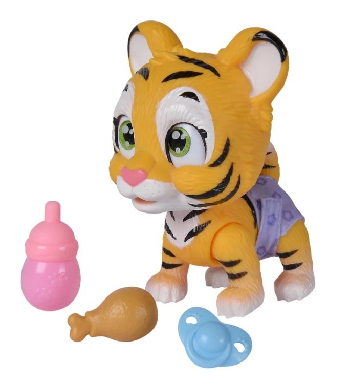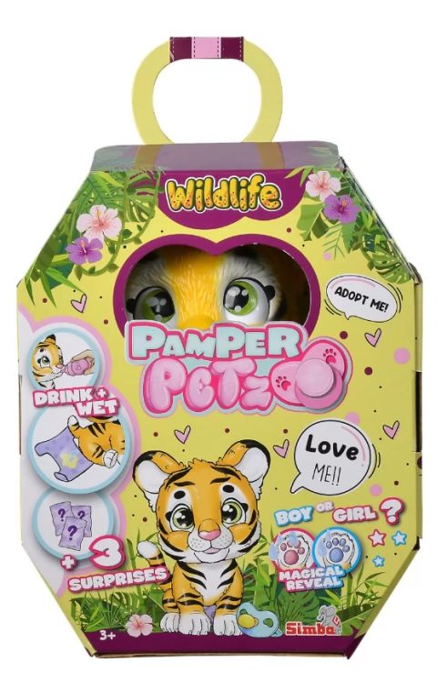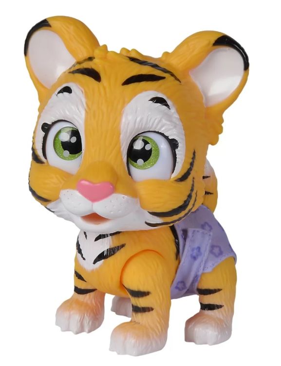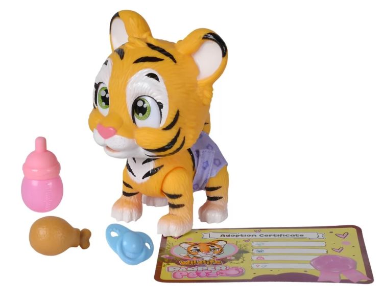 Dragutul tigru cu ochi mari si sclipitori poate bea in mod regulat din cand in cand face pipi in scutec. Animalutele dulci Pamer Petz cauta un stapan care sa le adopte sa le dea un nume si sa le ingrijeasca cu drag. Setul include trei accesorii pentru ingrijirea si hranirea tigrului precum si un certificat de adoptieSpecificatii