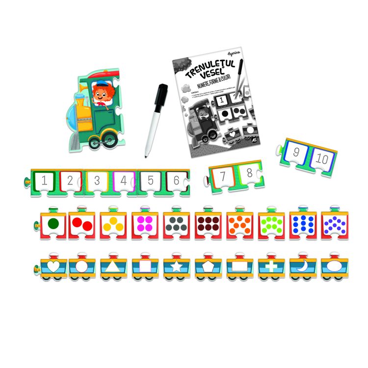 Trenuletul vesel: Numere, Forme siCulori este un joc educativ progresiv care vine sa-l ajute pe copil sa invete numerele si cantitatile, sa deseneze numerele si formele, invatand simultan culorile de baza. Copilul gaseste mai intai piesele cu numere conectandu-le la locomotiva trenului, apoi, recunoaste numarul si incearca sa gaseasca cantitatea corecta, adaugand a doua piesa cu puncte colorate. In cele din urma, conform culorii punctelor, copilul incearca sa gaseasca forma corecta care are conturul de aceeasi culoare. Continut: 5 cartonase cu numere, 10 piese de puzzle cu cantitati si culori si 10 piese de puzzle cu forme, 1 manual si 1 marker lavabil. Varsta recomandata 3-6 ani. Valori dezvoltatea - abilitati cognitive, miscarile fine ale mainilor, memoria, autonomia.