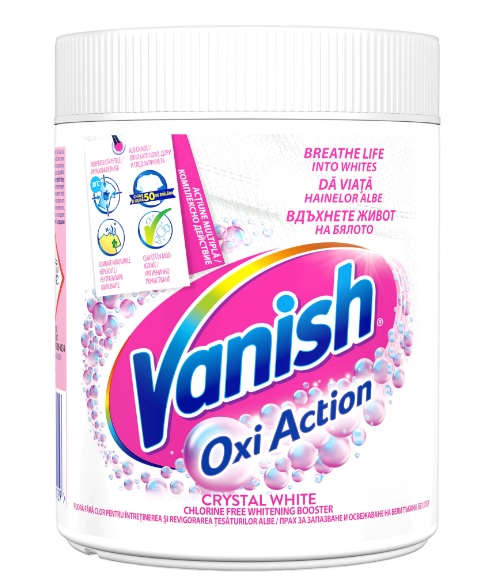 Vanish White inalbeste rufele albe la fiecare spalare, cu pana la 3 nuante mai albe fata de cele innegrite (rezultatele pot varia). Nu afecteaza tesaturile albe. Functioneaza chiar si la 30 grade Celsius.