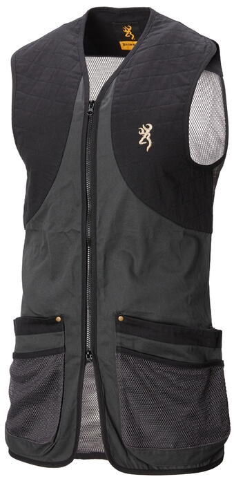 Vesta Browning în negru şi gri. Pe buzunarul din stânga pieptului este brodat logotip, iar textul "Browning" este imprimat pe spate, la baza gâtului, în galben.