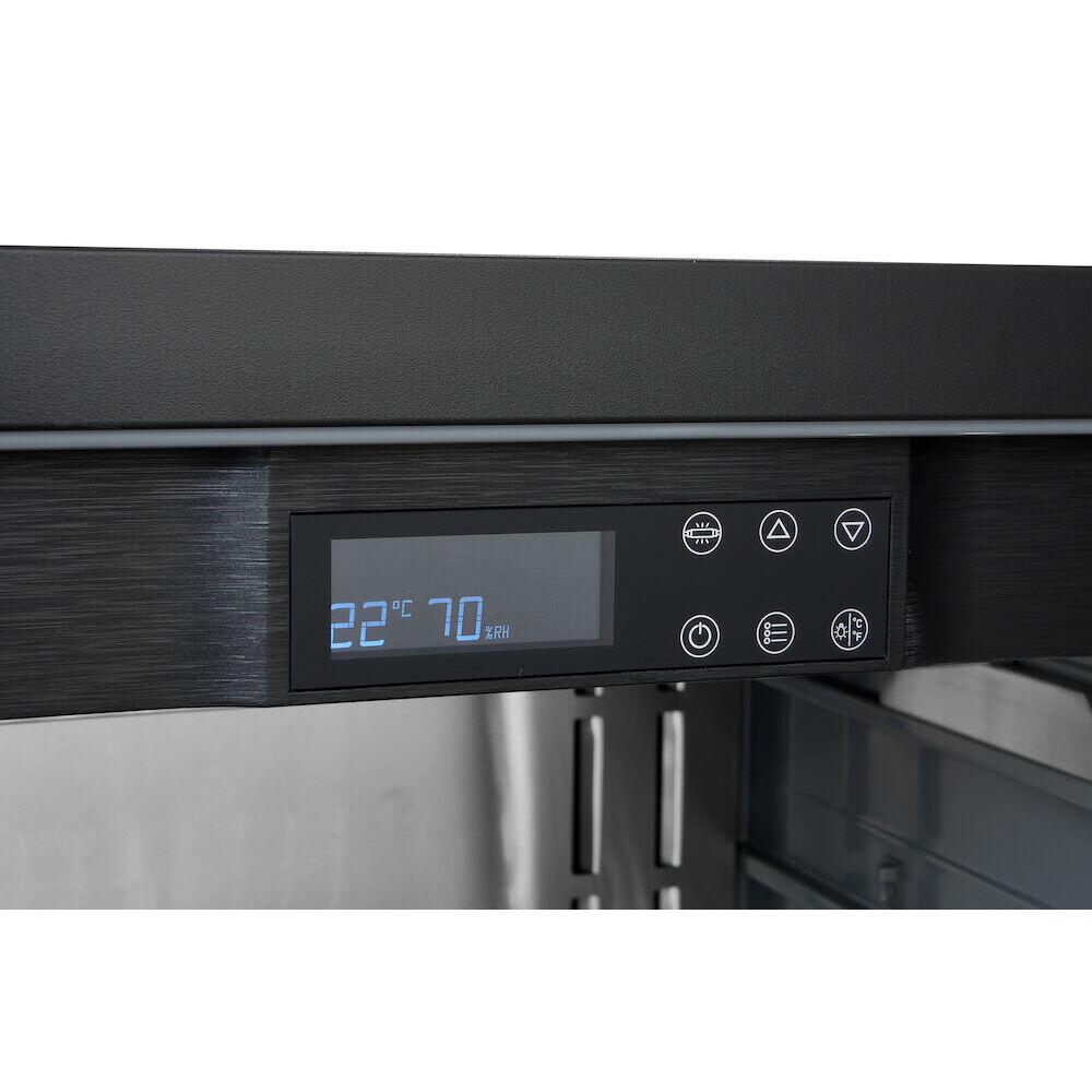 Corpul, cadrul usii si manerul sunt fabrocate din otel inoxidabil AISI 304. Usa fabricata din 2 straturi de sticla temperata colorata Low-E, care creste eficienta energetica prin blocarea luminii infrarosii, si a razelor UV din exterior, impiedicand in acelasi timp transferul de caldura in interior. Incuietoarea usii este inclusa. Recipient pentru apa distilata fabricat din ABS - apa distilata trebuie umpluta manual. Notificare pe afisaj si alarma sonora pentru a notifica atunci cand umiditatea este sub 15% pentru ca utilizatorul sa umple recipientul de apa. Alarma care indica faptul ca usa este deschisa mai mult de 3,5 minute - protectie impotriva perturbarii necontrolate a conditiilor din camera. Lampa de sterilizare UVC incorporata pentru a preveni dezvoltarea bacteriilor si pentru a garanta un mediu sigur pentru carne; atunci cand usa este deschisa in timpul procesului de condimentare, bacteriile nu au posibilitatea de a se dezovolta. Racire fortata prin intermediul unui ventilator care asigura nivelul necesar de circulatie a aerului. Lumini LED plasate pe ambele parti ale camerei si pe tavan. Sarcina maxima per carlig: 25 kg. Sarcina maxima a tijei de agatat: 50 kg. Intervalul de temperatura: 1 - 25 grade Celsius. Interval de umiditate reglabil: 60-85%. Nivelul actual de umiditate este afisat pe panou. Agent frigorific: R600a.