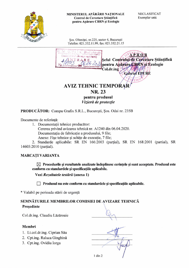 Viziera de protectie - aviz tehnic temporar emis de Ministerul Apararii Nationale